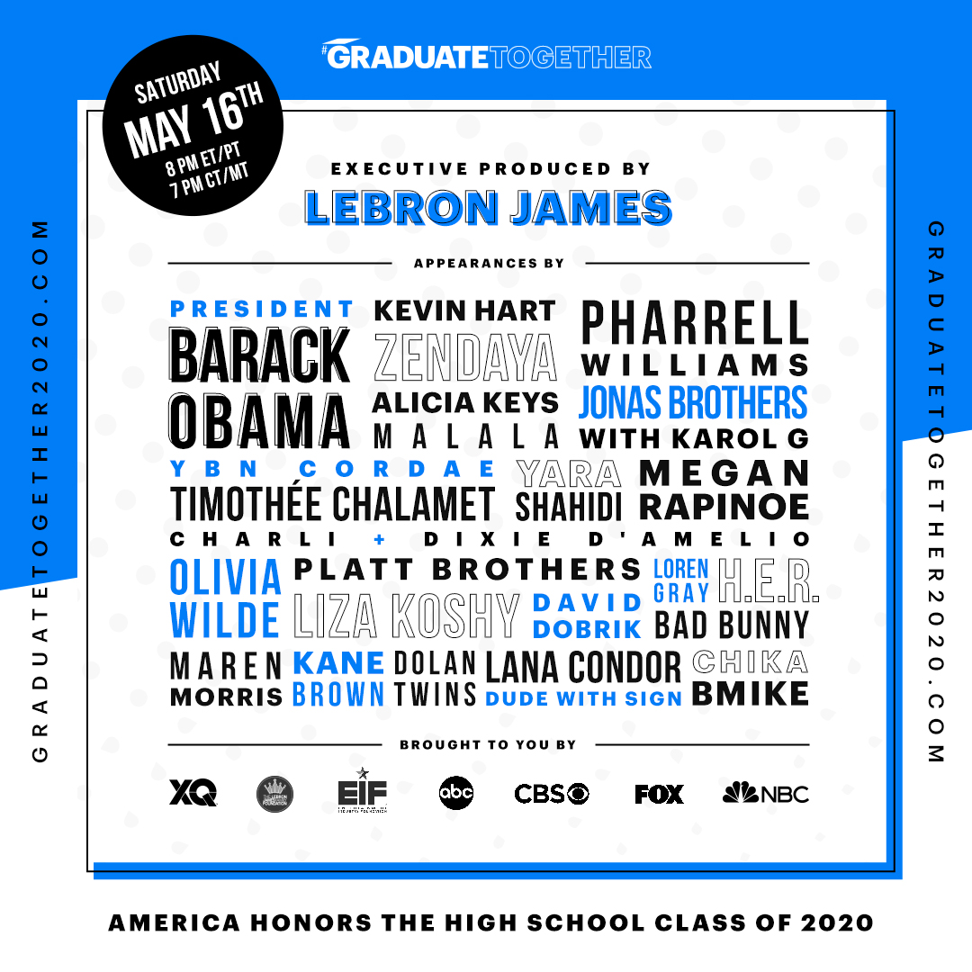 On May 16th, America will honor the High School Class of 2020 with a first-of-its-kind special graduation ceremony featuring former President Barack Obama, Lebron James, Kevin Hart, Pharrell Williams and so many more! The one-hour primetime special will take place 8 PM ET on TV One, as well as many other major TV media outlets. You can also tell Graduate Together what you want to see during your graduation ceremony by submitting your own story and tell us about others whose stories need to be told.